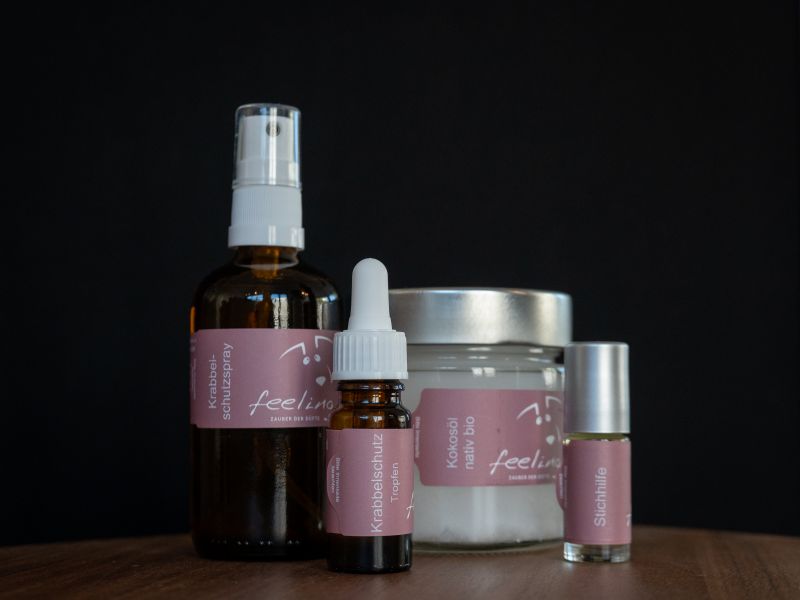Krabbelschutzspray: Ein natürlicher Insektenschutz zur prophylaktischen Anwendung auf dem Fell. Der Spray besteht aus natürlichen Inhaltsstoffen und enthält die ätherischen Öle Rosengeranie, Lavendel und Lemongrass die bewiesenermaßen insektenabweisend wirken. Er dient der äußerlichen Anwendung auf dem Fell und wirkt gegen Mücken, Zecken und andere Insekten.